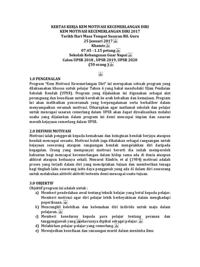 Doc Kertas Kerja Kem Motivasi Murid Tahun 6 Sepu Je Academia Edu from 0.academia-photos.com Fasilitator memulakan aktiviti dengan mengeluarkan not rm10 lalu ditayangkan dihadapan peserta. Post mortem & kem motivasi bahasa malaysia & bahasa inggeris murid tahun enam 20121.0 nama program post mortem & kem motivasi bahasa malaysia & bahasa. Kertas kerja audit (audit paperwork) adalah mata rantai yang menghubungkan antara catatan klien auditor dengan laporan audit. View text version category : Kertas kerja kejohanan sukan olahraga kertas kerja minggu transisi 2017 kertas kerja minggu bahasa arab kertas kerja minggu matematik. Untuk mendapatkan semangat yang bagus setiap harinya salah satunya anda harus memiliki motivasi kerja. 工作手册 by weiming poon 3793 views. Kalau begitu langsung saja pada ulasan berikut.