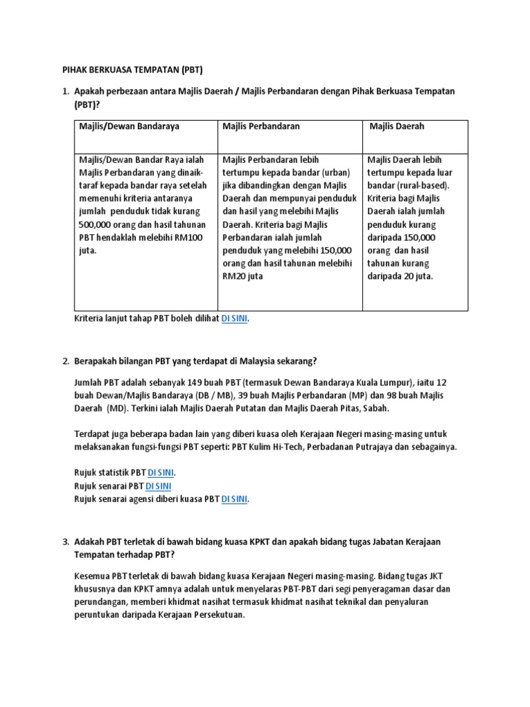 Berkuasa tempatan yang berkuatkuasa • operasi di kawasan pkpd tidak. Apakah perbezaan antara majlis daerah / majlis perbandaran dengan pihak berkuasa tempatan rujuk senarai pbt di sini rujuk senarai agensi diberi kuasa pbt di sini. Bolehkah pihak jkt/kpkt membantu orang ramai sekiranya ada masalah yang dihadapi di dalam kawasan pbt? Klik bendara negeri di bawah untuk senarai pbt negeri tersebut. Mesyuarat khas ahli jawatankuasa eksekutif persatuan pihak berkuasa tempatan malaysia (mala) bil.