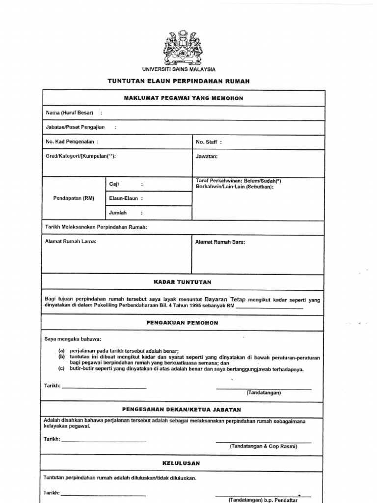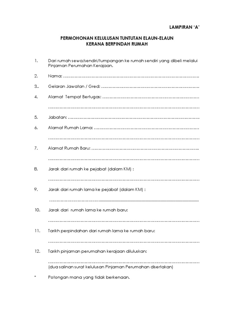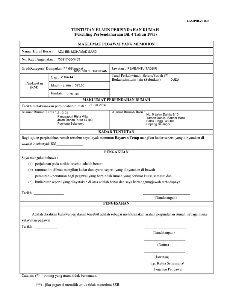 Borang Tuntutan Pindah Rumah A from imgv2-2-f.scribdassets.com Belanja pelbagai (kecuali bagi singapura, selatan thailand, brunei darussalam dan kalimantan ) i. Borang tuntutan elaun perpindahan rumah lampiran b 1. Maklumat pegawai yang memohon nama (huruf besar) :siti sakimah binti hussain no kadar tuntutan bagi tujuan perpindahan rumah tersebut saya layak menuntut bayaran tetap mengikut kadar seperti yang dinyatakan di jadual. Format borang tuntutan elaun kerja lebih masa. Kakitangan memproses tuntutan elaun perjalanan, elaun lebih. Salah 1 elaun itu adalah elaun pindah rumah. Permohonan kelulusan tuntutan elaun kerana berpindah rumah.doc view download. Surat kelulusan persaraan dari jabatan perkhidmatan awam (jpa) b.